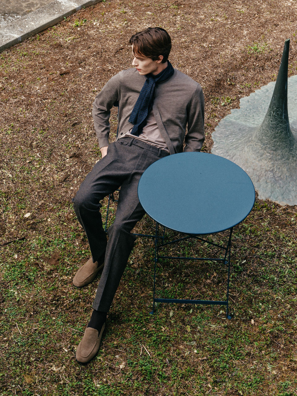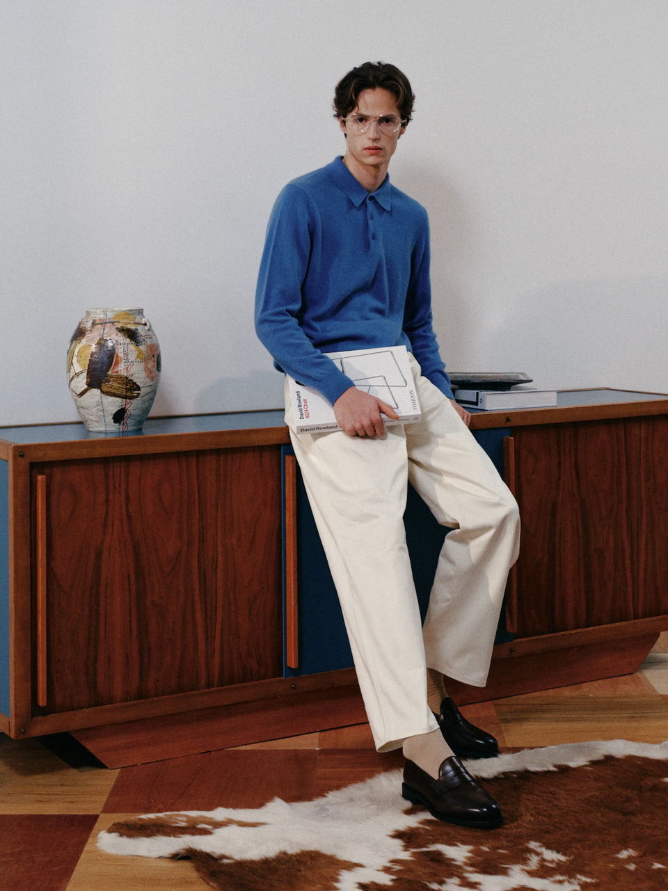 This knit is made of 100% Australian extra fine merino wool, offering a soft and lightweight feel.